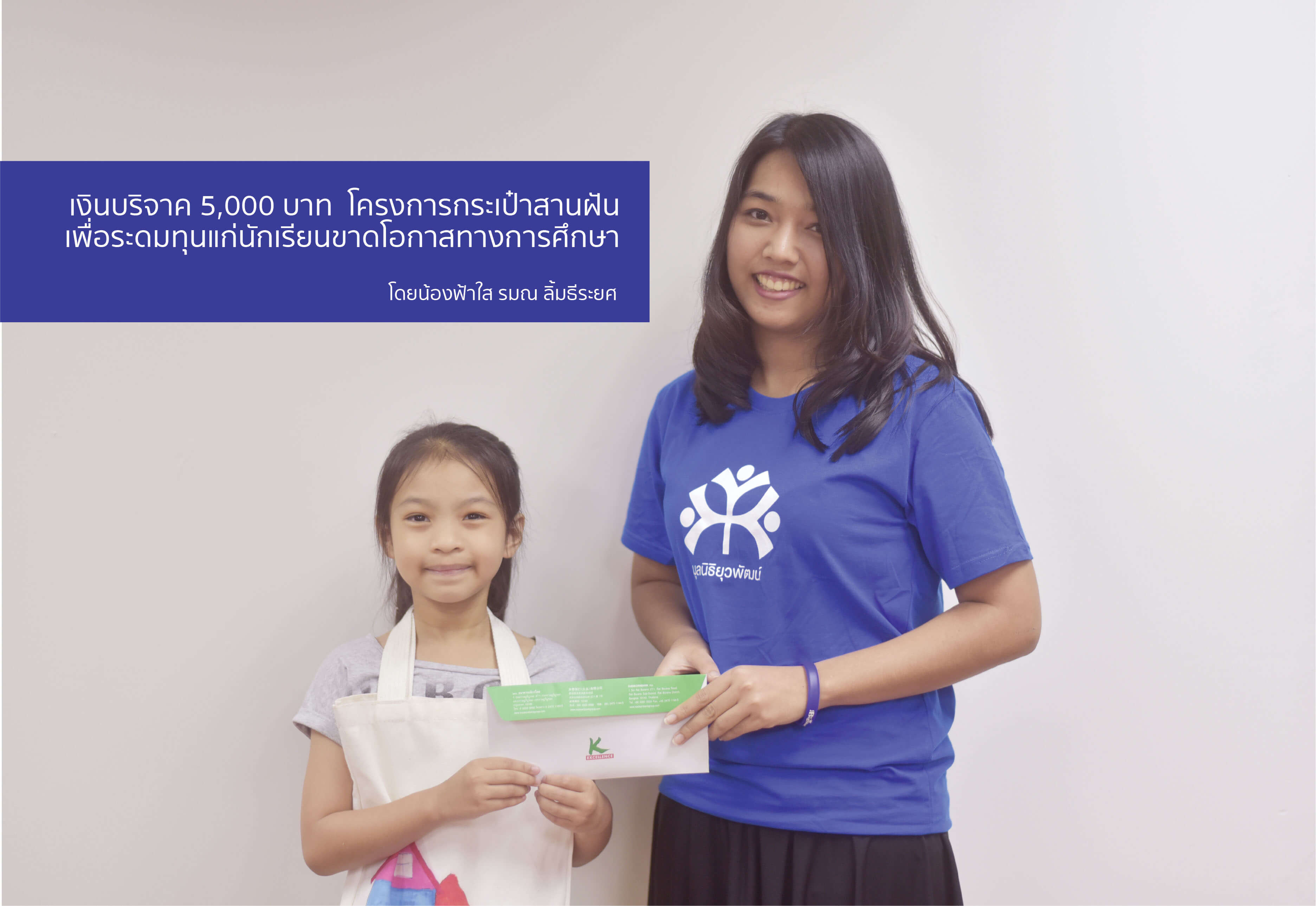 เงินบริจาค 5,000 บาท จากการจำหน่ายถุงผ้าที่น้องฟ้าใส เด็กหญิงในวัย 9 ขวบ ที่ตอนนี้กำลังเรียนอยู่ชั้น ป.3 ได้ทำโครงการจิตอาสาของทางโรงเรียน โดยน้องฟ้าใสมีความสามารถในการวาดรูปและอยากทำกิจกรรมช่วยเหลือสังคม จึงได้คิดและทำกิจกรรมอาสาและใช้ชื่อโครงการว่า “กระเป๋าผ้าสานฝัน เพื่อระดมทุนแก่นักเรียนขาดโอกาสทางการศึกษา” กิจกรรมครั้งนี้น้องฟ้าใส ได้ลงมือวาดภาพเองและนำภาพที่วาดไปพิมพ์ลงบนถุงผ้าและนำไปจำหน่าย โดยน้องฟ้าใสได้เริ่มทำโครงการนี้มาตั้งแต่เดือนสิงหาคมจนถึงเดือนตุลาคม ที่ผ่านมา