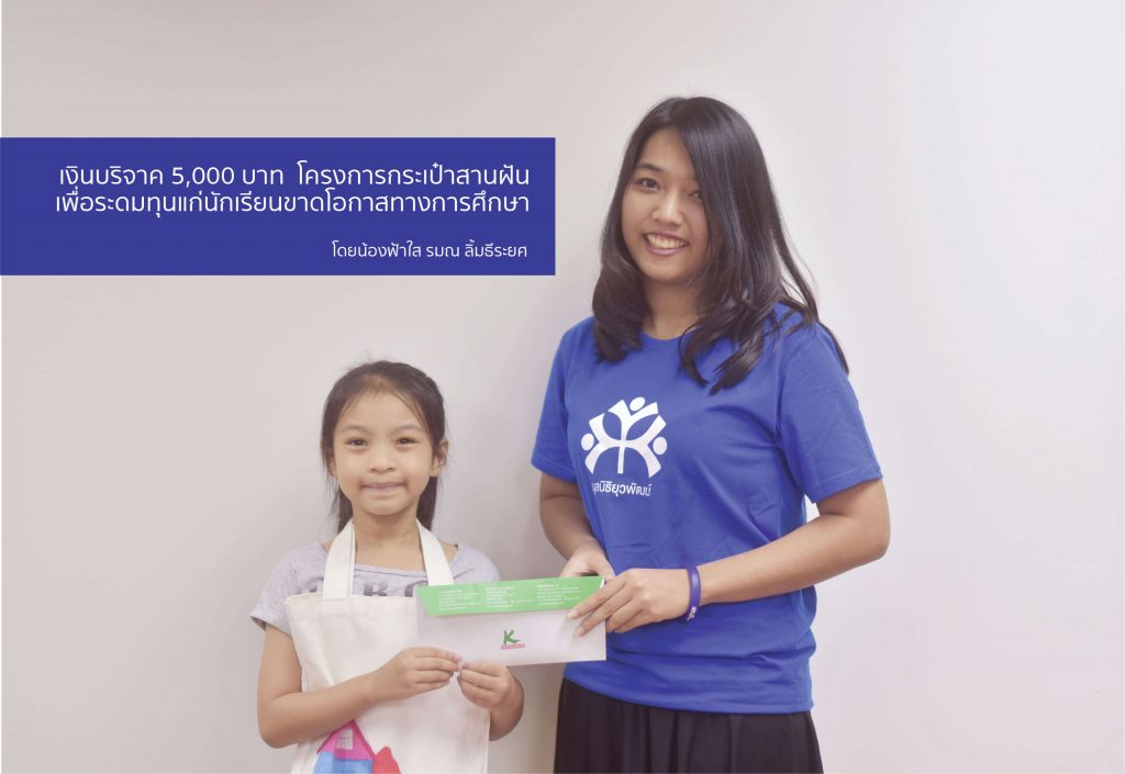 เงินบริจาค 5,000 บาท จากโครงการกระเป๋าสานฝัน เพื่อระดมทุนแก่นักเรียนขาดโอกาสทางการศึกษา ใน มูลนิธิยุวพัฒน์ โดยน้องฟ้าใส รมณ ลิ้มธีระยศ